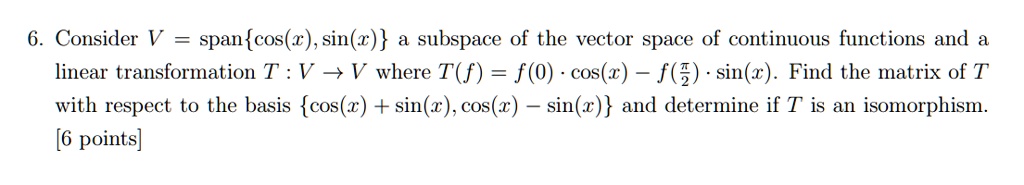 6. Consider V span{cos(r) , sin(x) } subspace of the vector space of continuous functions and linear transformation T : V _ V where T(f) = f(0) - cos(z) - f(3) - sin(r) . Find the matrix of T with respect to the basis {cos(z) + sin(x) , cos(z) sin(z)} and determine if T is an isomorphism: [6 points]